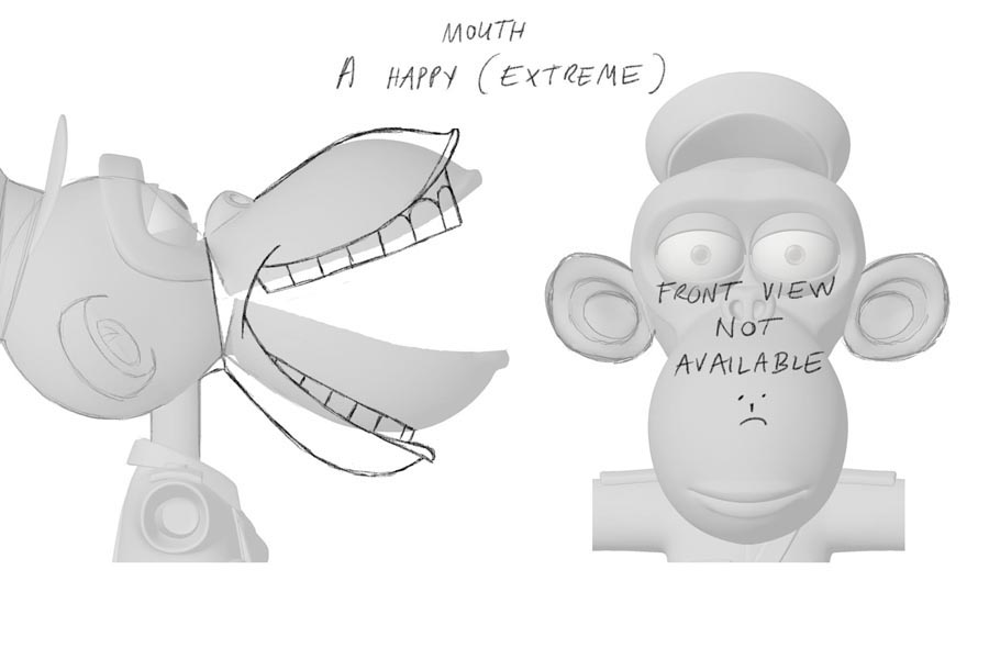 The studio wanted to do a teaser trailer to help finalize the funding for the feature project, so I did some quick sketches of various mouth shapes as inspiration for a simple temporary facial setup.